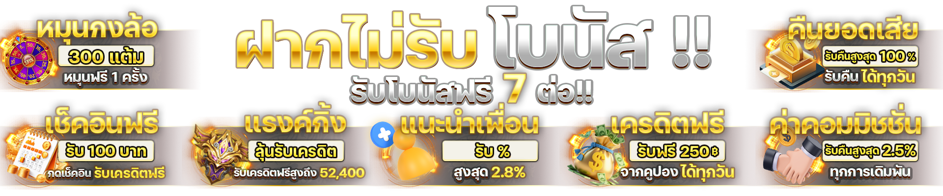 เริ่มต้นด้วยโบนัสต้อนรับ 100% สำหรับการฝากครั้งแรก ซึ่งหมายความว่าถ้าคุณฝากเงิน 1,000 บาท คุณจะได้รับเครดิตเพิ่มอีก 1,000 บาททันที นอกจากนี้ เรายังมีโปรโมชั่นเงินคืนรายวันสูงถึง 0.8% สำหรับสมาชิกทุกระดับ โดยไม่มีเงื่อนไขยอดเทิร์นโอเวอร์ที่ยุ่งยาก